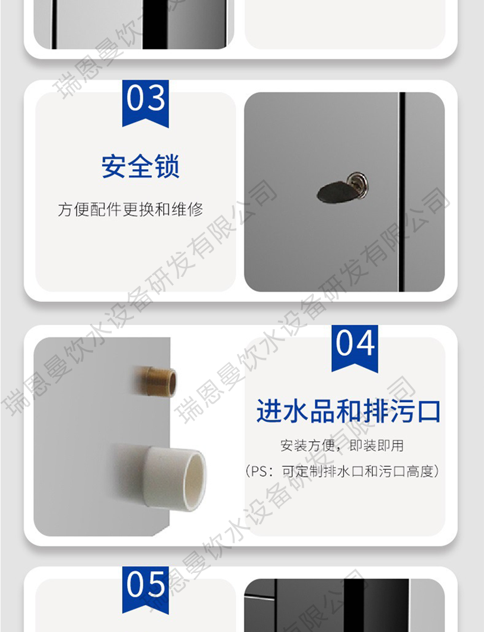 所有饮水机出厂均符合《生活饮用水卫生标准》(GB 5749-2022)的规定及ISO9001、卫生部许可证、SGS认证、3C认证,同时还应考虑水源质量要求、水量充足、水质稳定、水源可靠、水压适中、水温适宜等方面的要求,以确保提供安全、健康的饮用水。